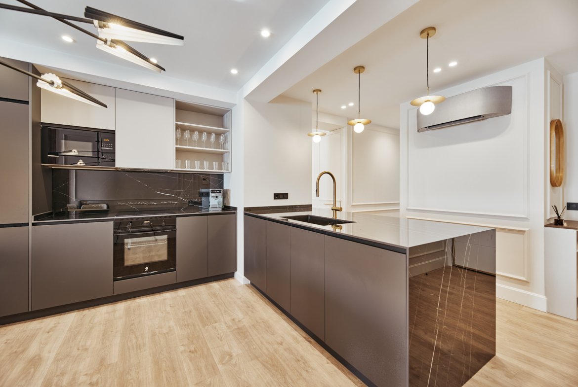 La cocina equipada, diseñada bajo criterios de eficiencia y estética, se integra con naturalidad en el conjunto, favoreciendo la fluidez entre ambientes.