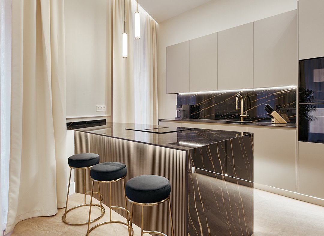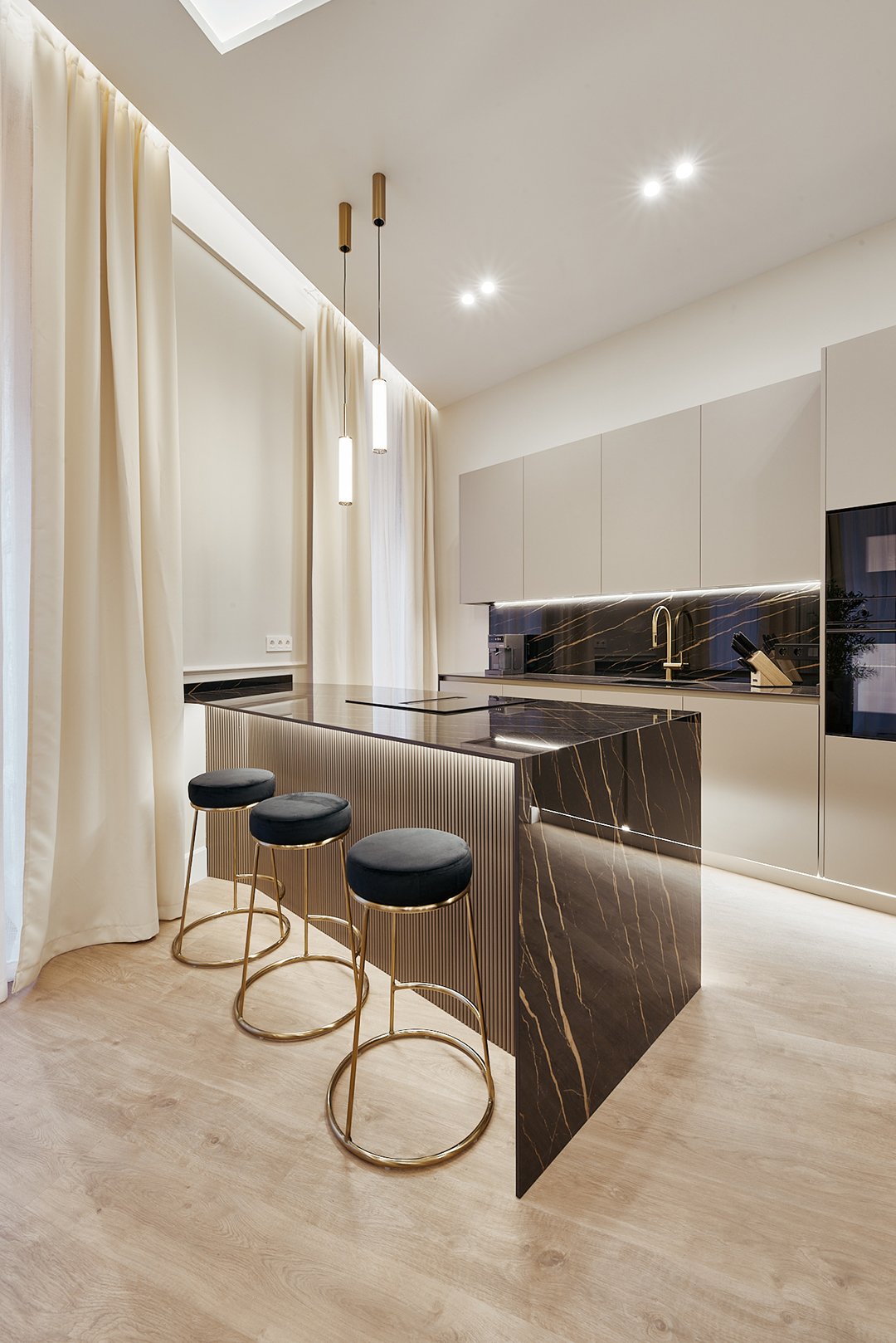 Los interiores destacan por la elegancia de sus materiales y la coherencia de su diseño: carpintería de suelo a techo, iluminación arquitectónica, texturas nobles y una paleta neutra que transmite serenidad.