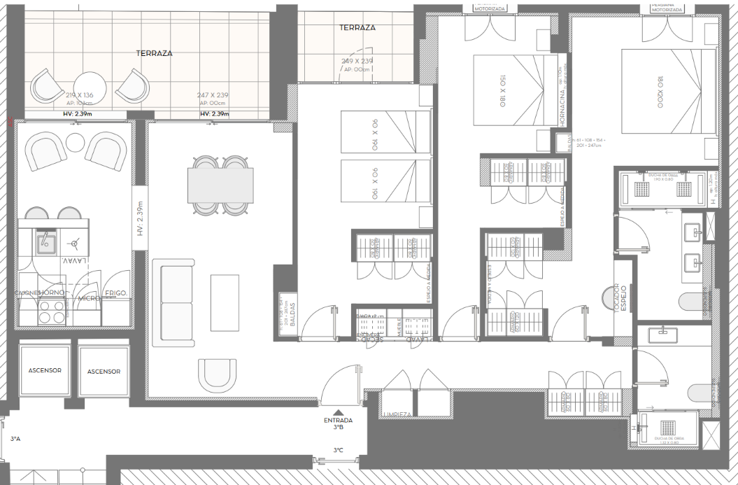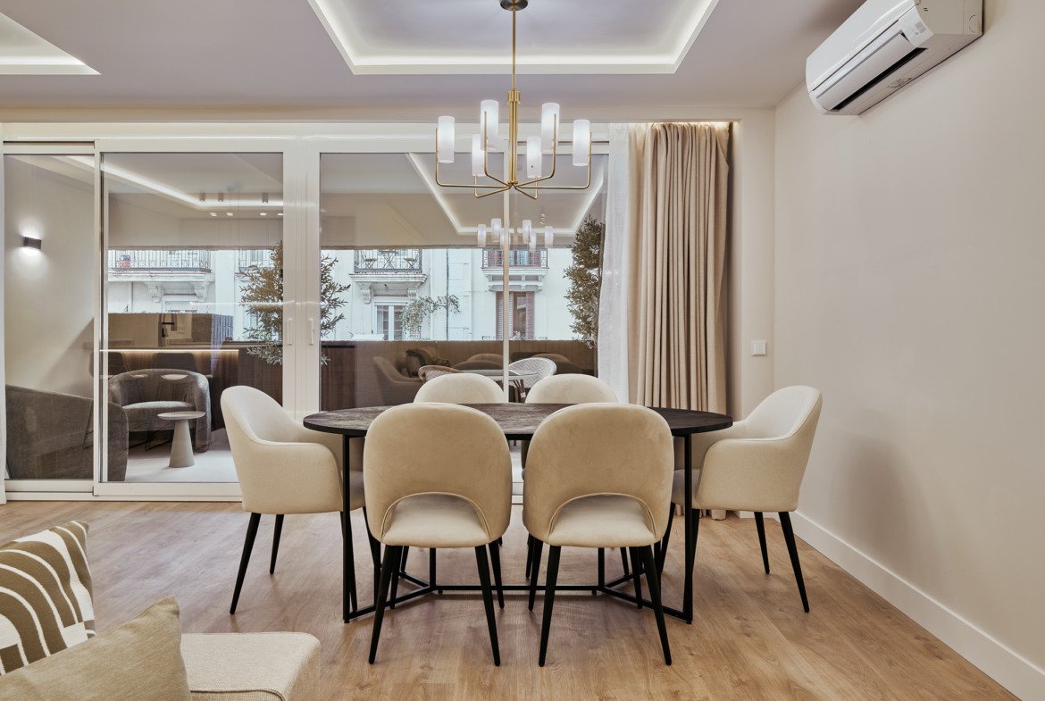 El inmueble ha sido transformado y se entrega completamente amueblado. La zona de día se articula en torno a un salón-comedor luminoso, con salida a uno de sus dos balcones exteriores, creando un espacio cómodo y agradable para el día a día.