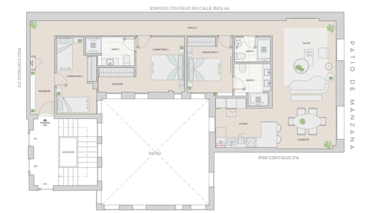 Una vivienda serena y funcional de 124 m2 catastrales, ubicada en una segunda planta interior a patio de manzana, pensada para quienes valoran la calma, la luz natural y una distribución cómoda en el corazón del barrio de Ibiza.