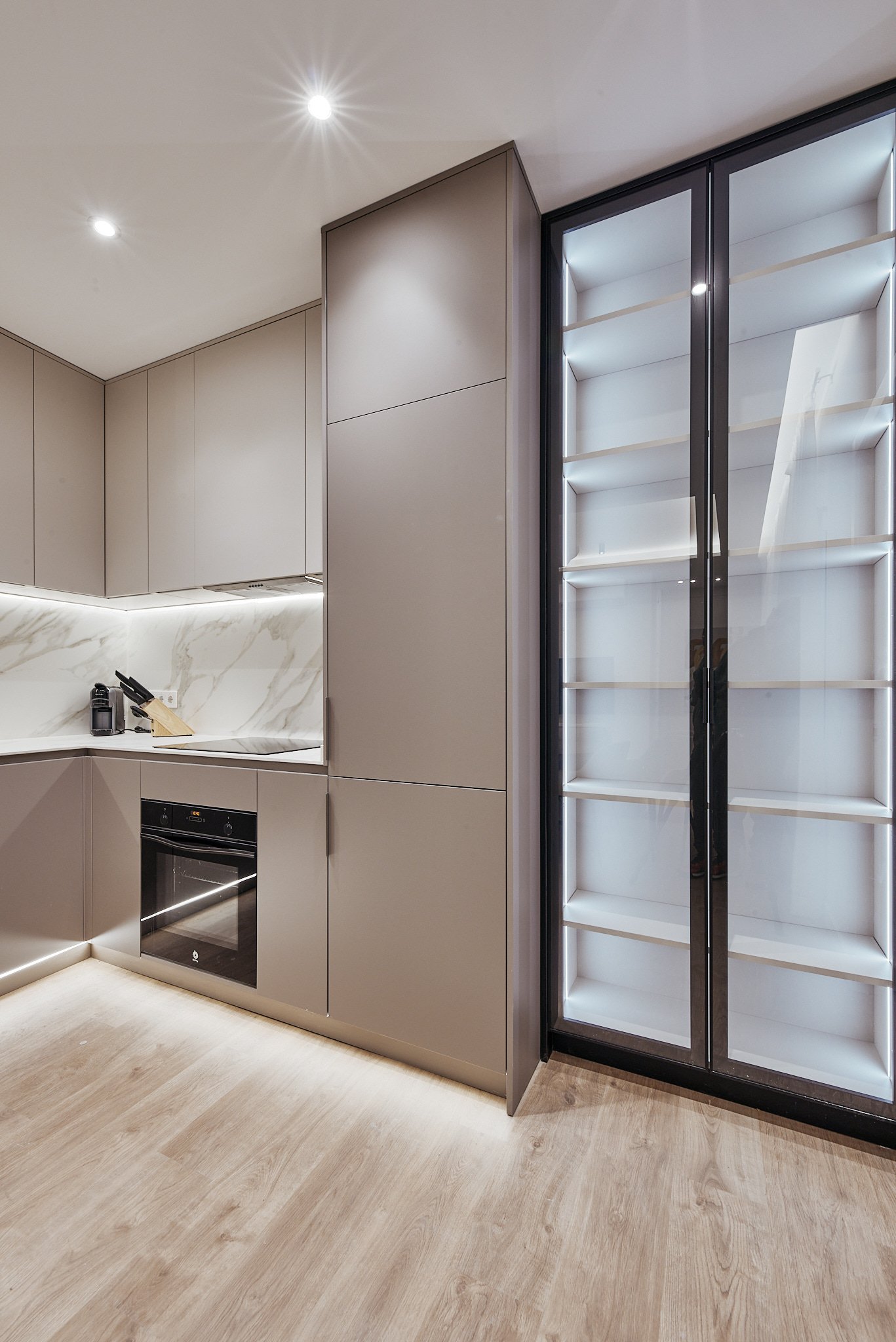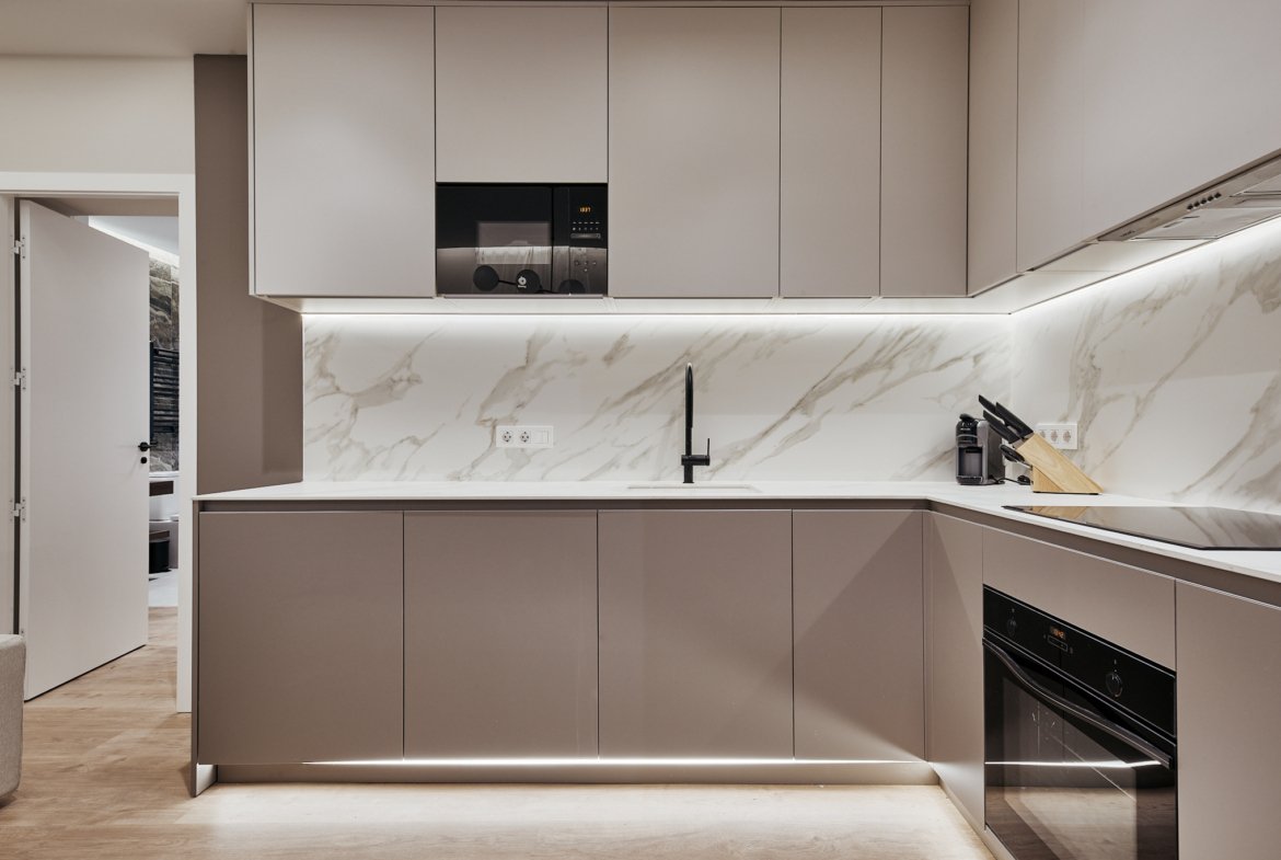 Situada en la cuarta planta de una finca clásica de 1930, la vivienda cuenta con 80 m² catastrales y ha sido diseñada para optimizar el espacio y la luz, manteniendo una estética sobria y atemporal.